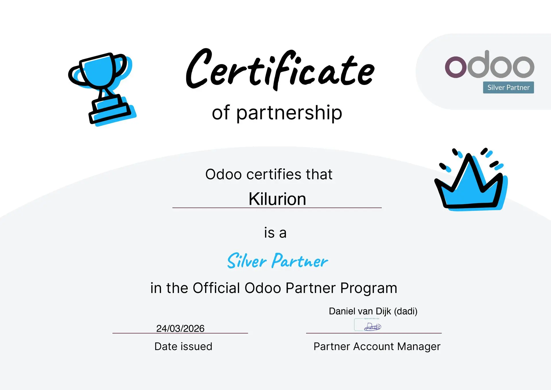 Kilurion heeft de status van Odoo Silver Partner behaald. Een mooie mijlpaal die bevestigt dat we beschikken over de juiste ervaring, kennis en track record om succesvolle Odoo-implementaties te realiseren.