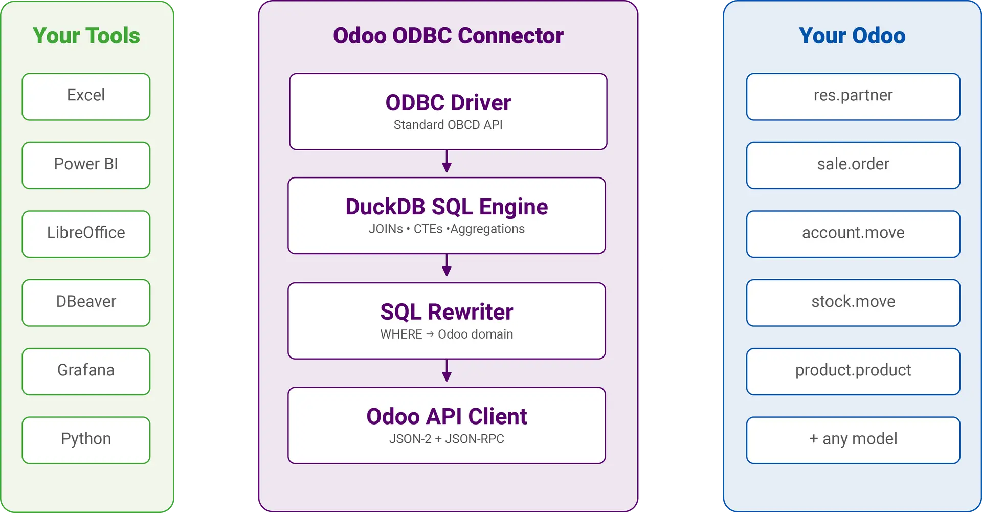 Stuur resultaten naar CSV, Parquet of een lokale DuckDB-tabel voor razendsnelle herhaalde queries. Of koppel je favoriete BI-tool via ODBC — Excel, Power BI, LibreOffice, Grafana, DBeaver — en bouw dashboards direct op live Odoo-data.